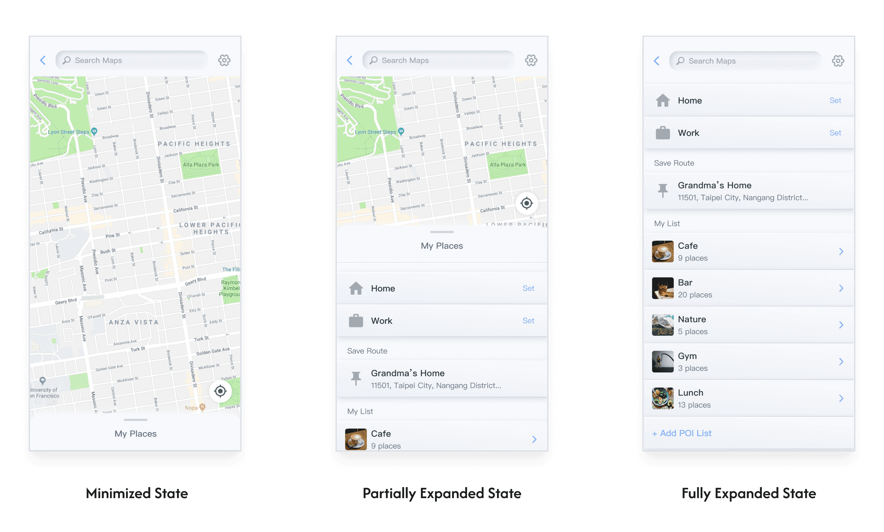 Minimized state, ideal for focusing on a full map view or nearby landmarks; Partially expanded state, allowing partial map information and quick access to frequently used actions ;Fully expanded state, designed for reviewing saved navigation options without distractions from other information.