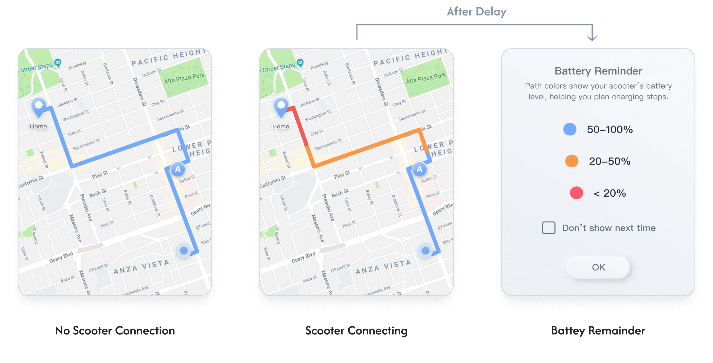 When the device is successfully connected to the scooter via Bluetooth, the system displays the scooter’s battery status on the navigation map using different path colors, allowing users to decide whether to charge or swap batteries.