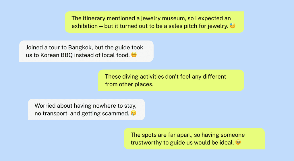 😥 Users worry about poorly planned trips or being overcharged by travel agencies.
