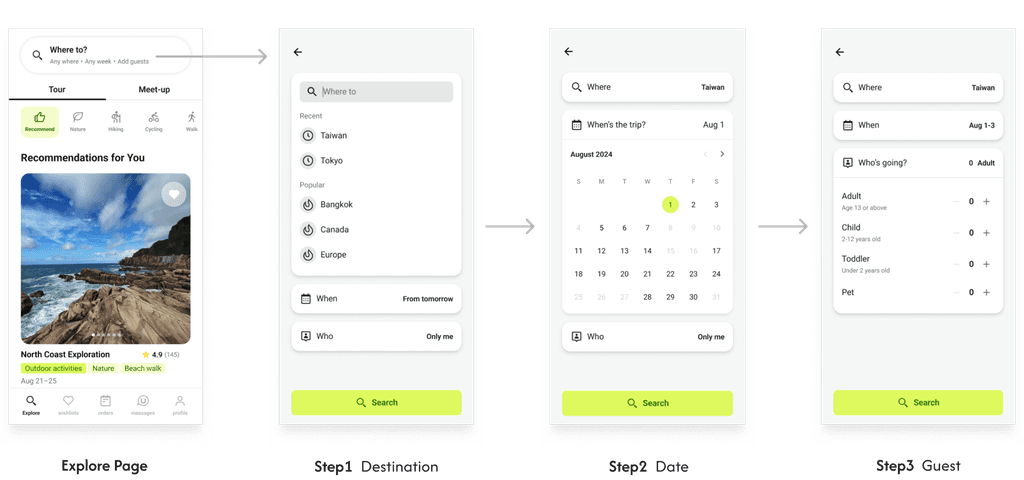 We designed a new search flow for the platform homepage. Instead of a traditional search bar, we use a “tapping” interaction for a more intuitive experience. Users can simply tap on options like destination, date, and group size to quickly find their ideal trip, making the process easier and more seamless.